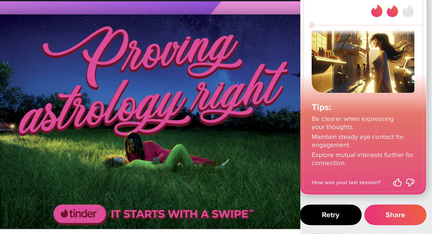 LEFT: 2023 Tinder ad. RIGHT: 2025 Tinder “flirtbot?”
