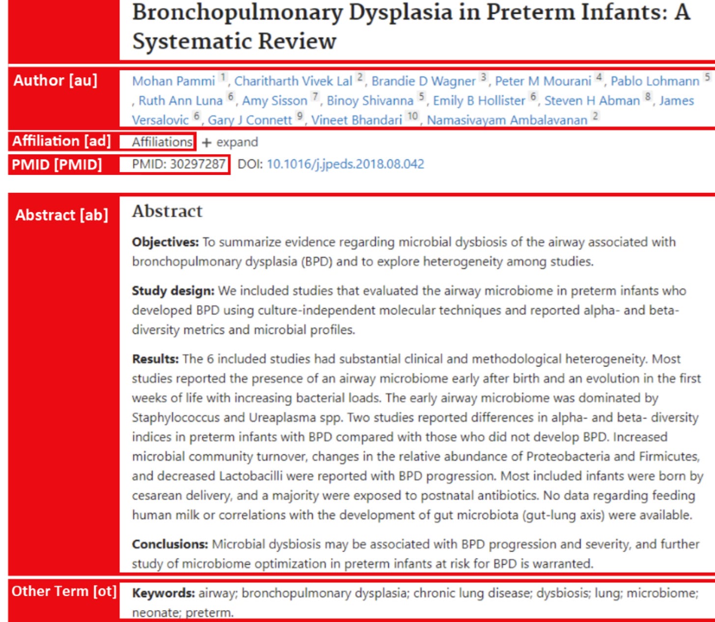 Example Pubmed paper layout with a list of keywords, and title and abstract that contain such keywords.
