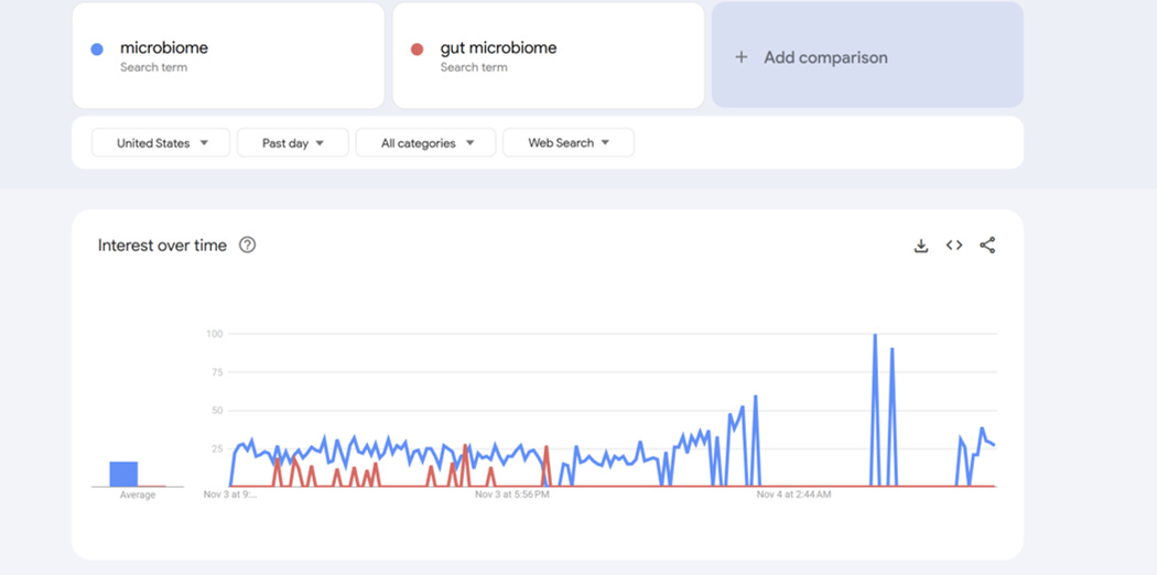Google Trends Trends allows you to compare the popularity of broad versus specific keywords, such as the generic term “microbiome” versus the more specific term “gut microbiome.” While the broader term “microbiome” generates more overall interest over time, the more specific term “gut microbiome” connotes content related to health, diet, and wellness products and might be more relevant to audiences with health-related search intent for microbiome.